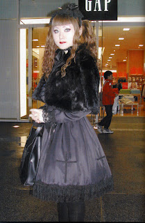 Mas nao só de preto vive gothic, mas todas as outras cores eram usadas com o preto: bordo com preto, preto e branco, etc. Ai, entram as combinaçoes. Gothic NUNCA na vida foi coordenado perfeitinho. Nao to dizendo que nao da pra fazer, mas as "trends" dentro do gothic nao envolvem a coordenaçao perfeitinha que encontramos frequentemente em sweet. Aqui, isso nao muda. Mas, a coordenaçao mais legal que eu vejo no gothic é com preto e branco. Eles espalham muito bem o branco por todo o coord, mas nenhuma peça é totalmente branca. Ou seja, sapatos pretos, mas a meia tem detalhes brancos o suficiente pra nao ficar destonado com o resto. Isso, combinado com a saia mais curta, o cabelo trabalhado nas pira (isso mais em revistas, pra sair na rua era mais cabelo lisao mesmo), as mangas sino e as fuckin awesome plataformas formavam gothics lindos.
